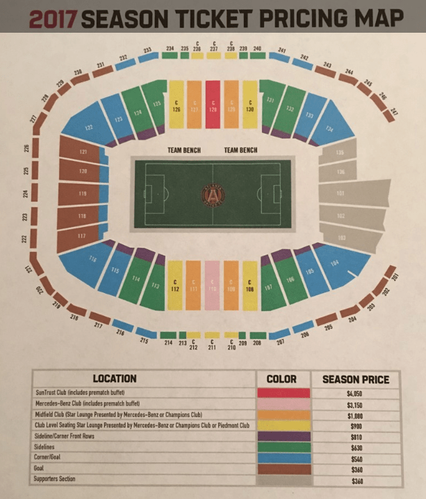 Which sections are club level at mercedes benz stadium? Club level seats at mercedes benz stadium are in . Seating charts for atlanta falcons, atlanta united. Atlanta falcons/full stadium virtual seating map atlanta united virtual seating map. Includes row and seat numbers, real seat views, .